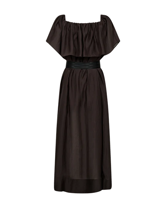 CMMOLLY-DRESS är en off-shoulder klänning som innehåller mycket lyocell. Klänningen har en bred volang upptill, sidofickor och ett bälte med logotryck i midjan.